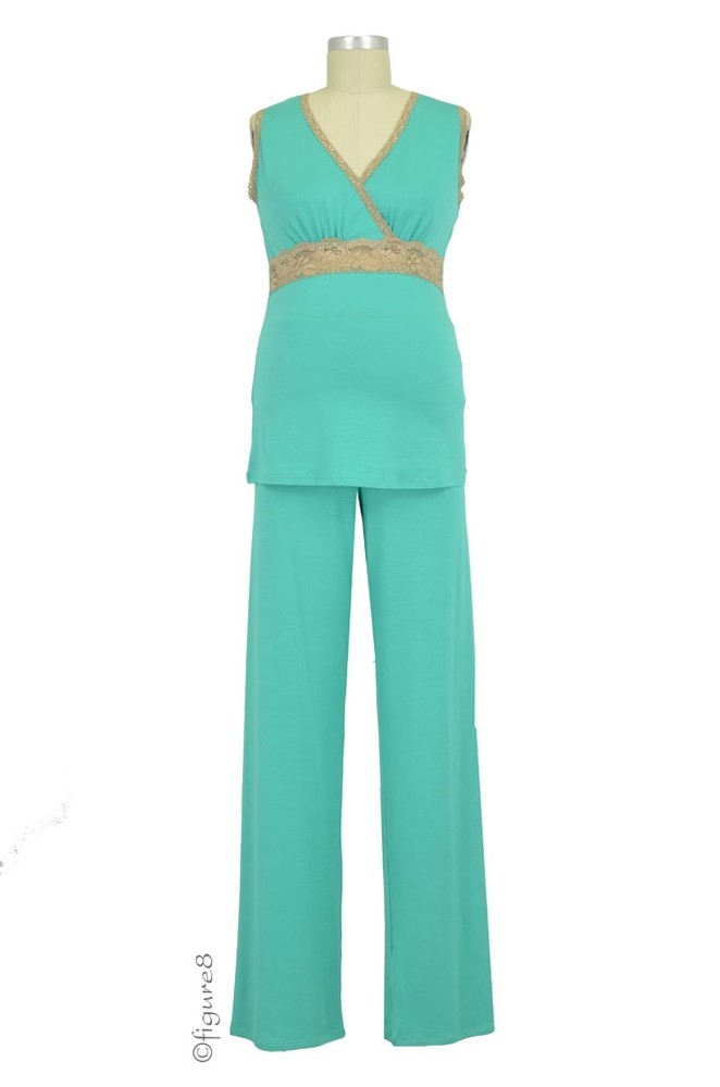 Cute, comfy, and just right for late night feedings and all day lounging. The addition of lace makes this comfortable pj set, Sexy! This ultra soft sleeveless nursing top and pant set will be your favorite way to unwind with your new little one! Easy pull aside nursing friendly access. Also features ~31" inseam pants with belly panel to wear under or over your belly.